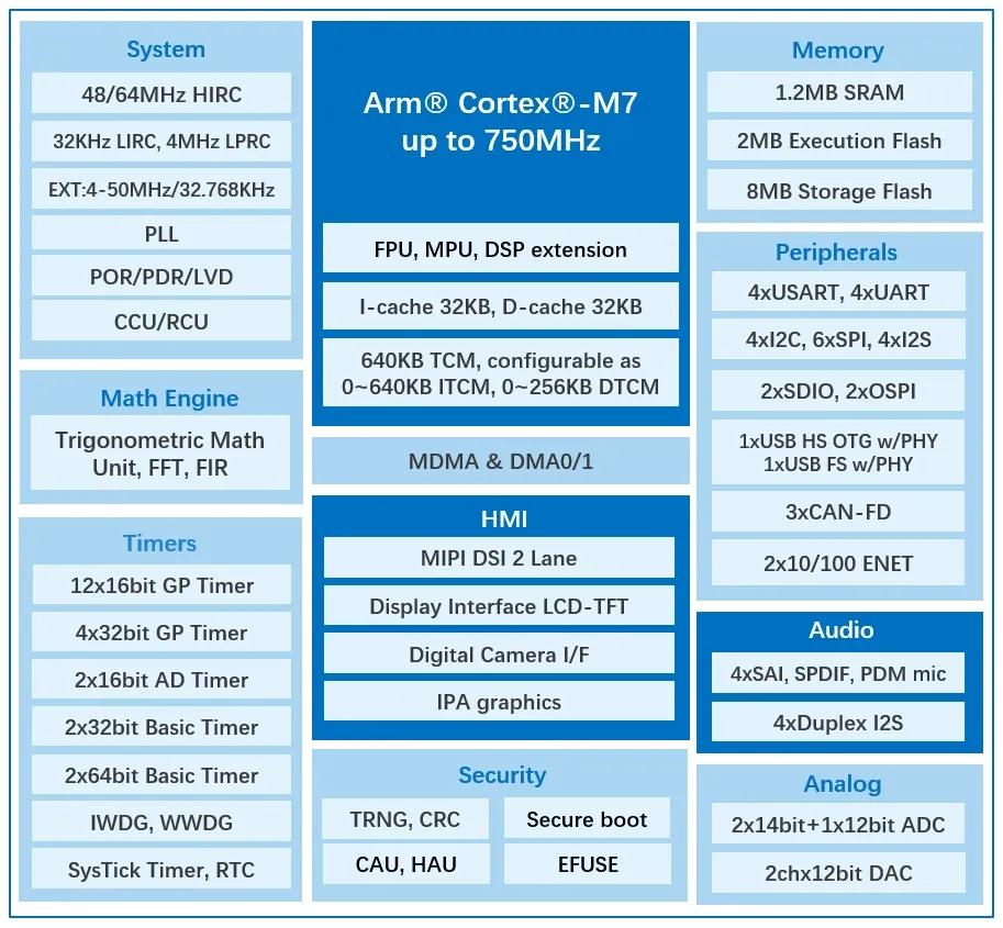 该系列拥有优异的存储配置,集成了2MB Execution Flash与8MB Storage Flash,并搭载1.2MB的SRAM,其中特别配备高达640KB大容量紧耦合内存(TCM),可与CPU同频运行,实现指令与数据的零等待执行。这一核心架构设计可让CPU以峰值效率持续运行,充分释放其全部计算潜能,确保系统即便在极度消耗算力的实时任务、复杂控制算法及高频数据处理中,也能实现更快、更稳定的代码执行,为高端嵌入式应用提供了至关重要的性能基础。