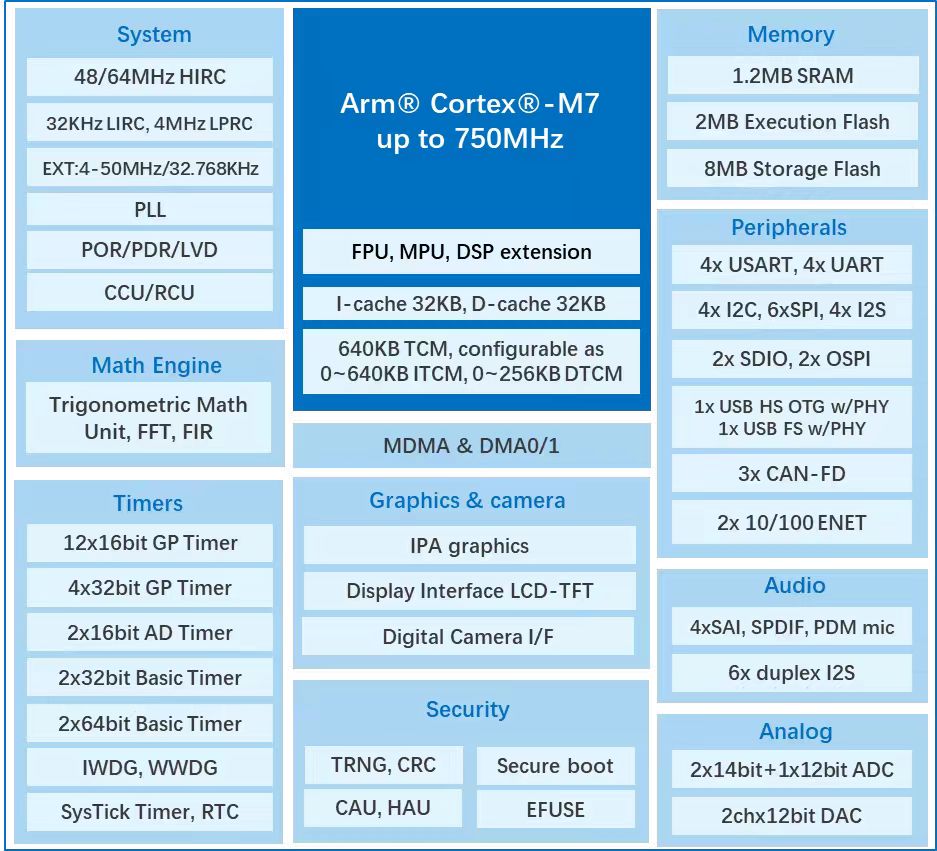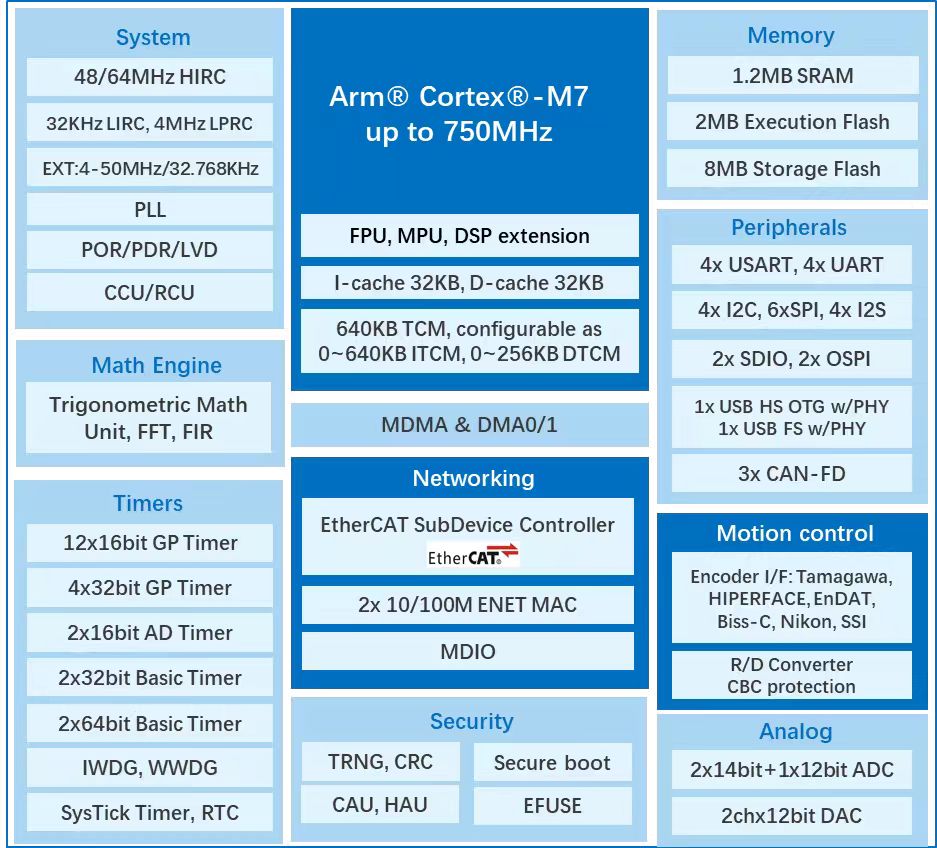 GD32H78E/77E、GD32H789/779系列MCU均基于性能强悍的Cortex®-M7内核,主频高达750MHz。该系列芯片拥有超高存储配置,最高可支持2MB Execution Flash与8MB Storage Flash,并搭载1.2MB的SRAM,更特别配备高达640KB大容量紧耦合内存(TCM),实现CPU同频运行,指令与数据的零等待执行。无论是高实时任务、复杂算法还是密集型数据处理,这一革新架构可让算力持续释放,系统响应更快、执行更稳。