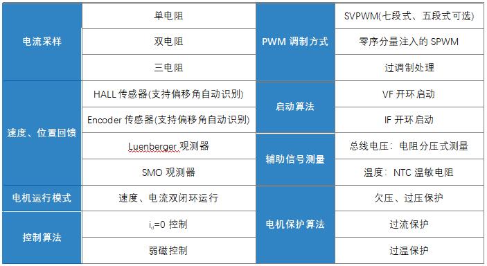 演示套件支持多种PWM调制技术、多种电流采样方式,支持多种有感、无感转子位置、速度回馈方式,用户可根据需求选用,另外还具有硬件电路自检和多种电机保护功能。
