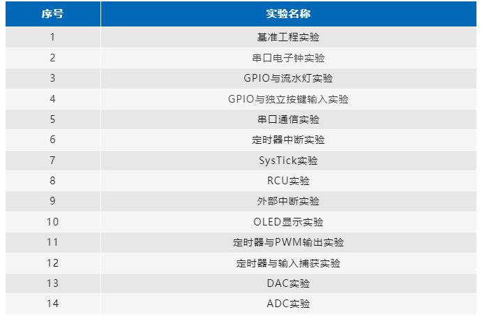 本系列教材通过一系列实验,由浅入深地介绍GD32E230的各种基础片上外设的原理及其设计开发流程,实验清单如下表所示:
